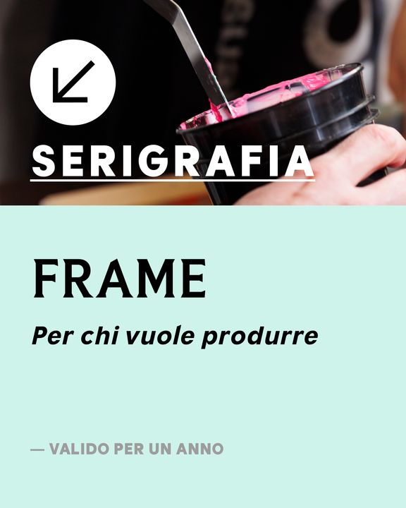 FRAME – Per chi vuole produrre Il pacchetto "FRAME" è pensato per chi desidera portare la propria serigrafia al livello successivo. Con 300€, avrai la possibilità di lavorare su due soggetti, a due colori ciascuno, per un risultato professionale e di alta qualità: