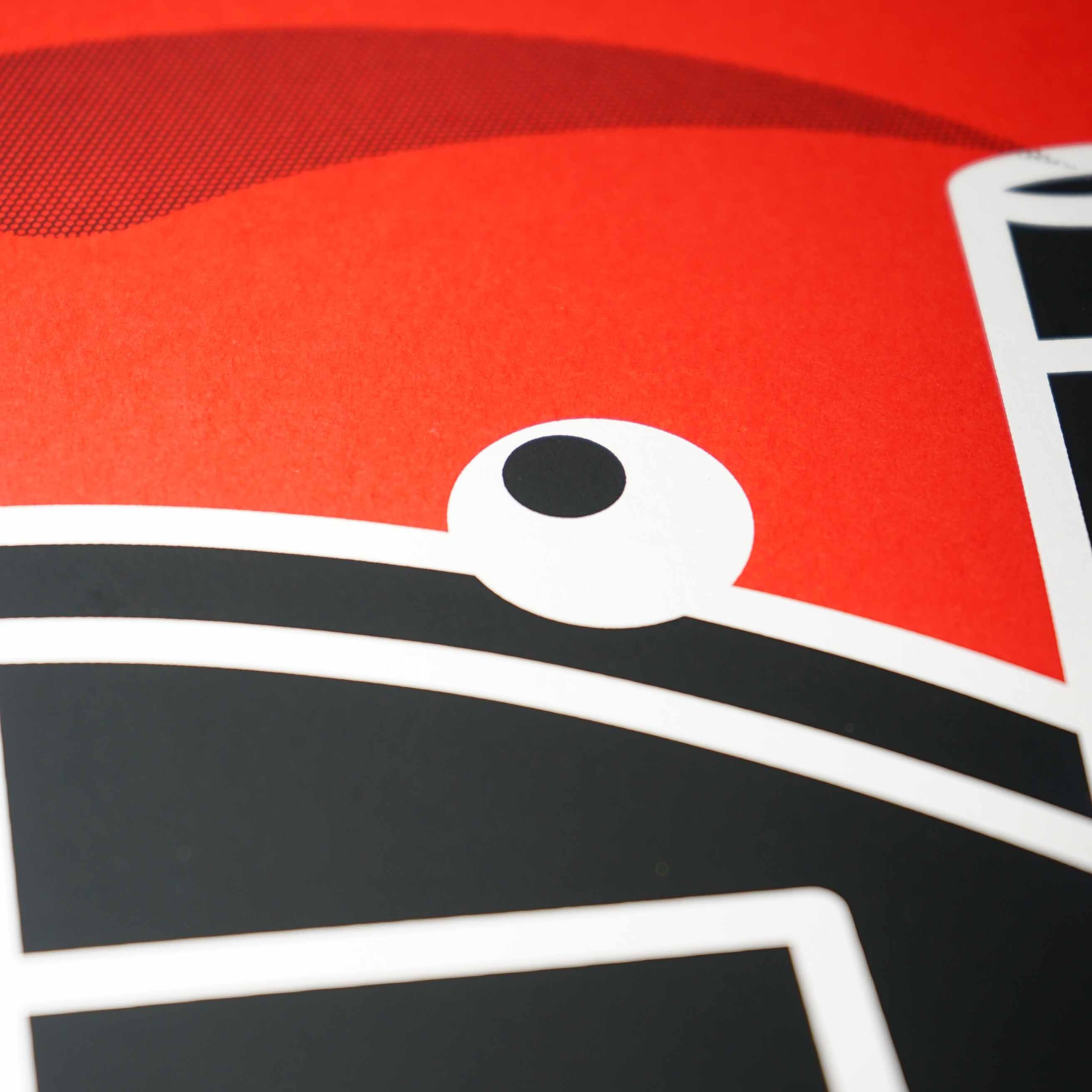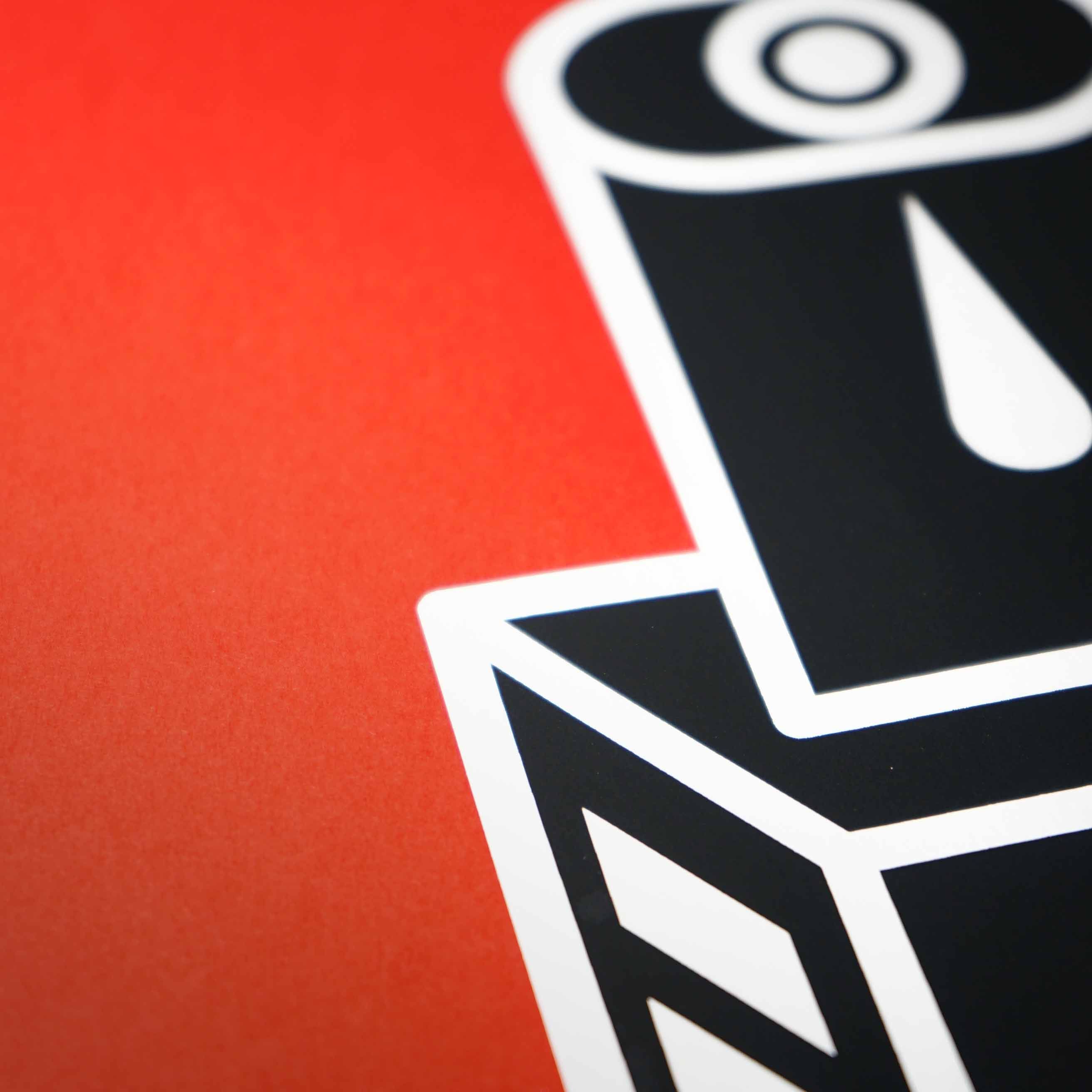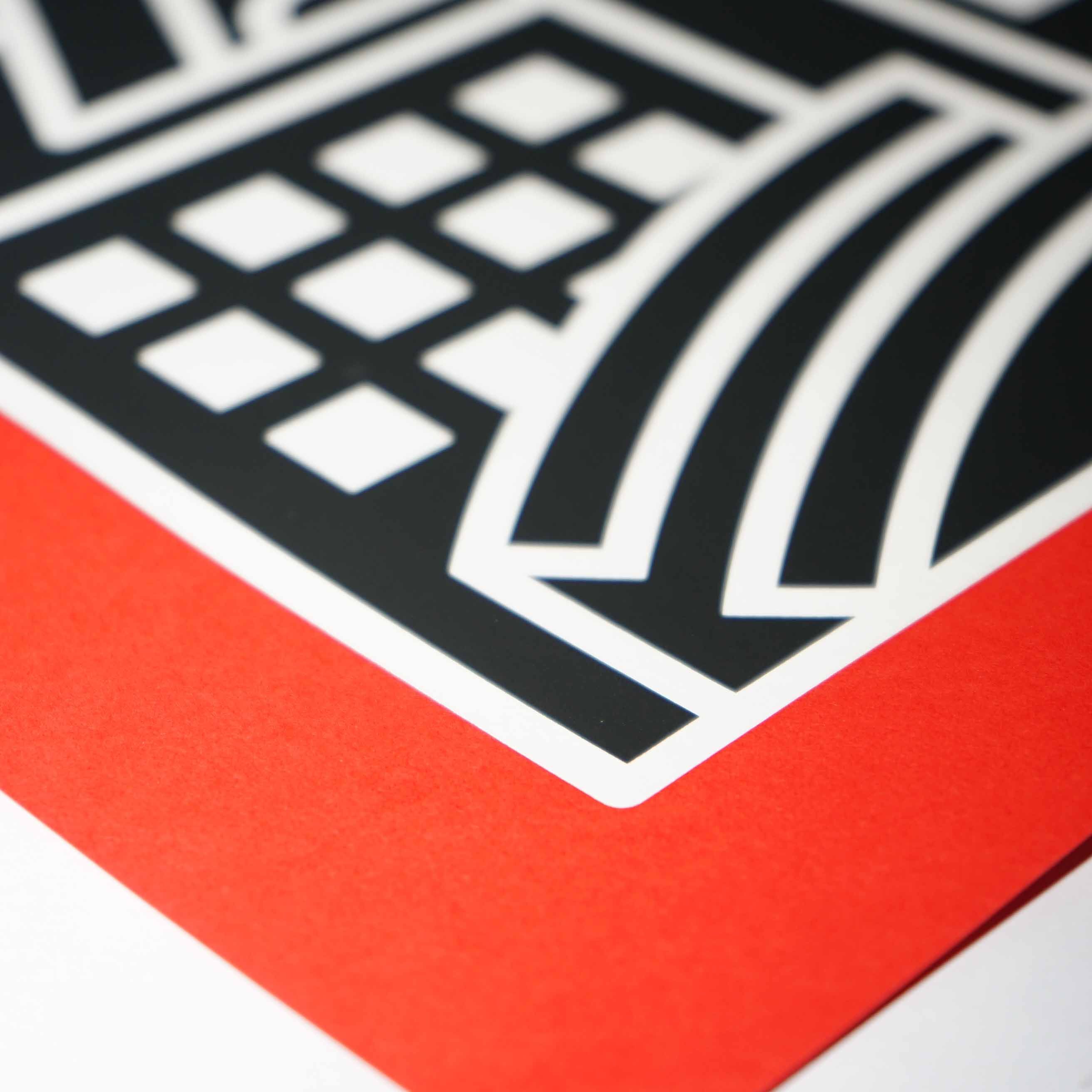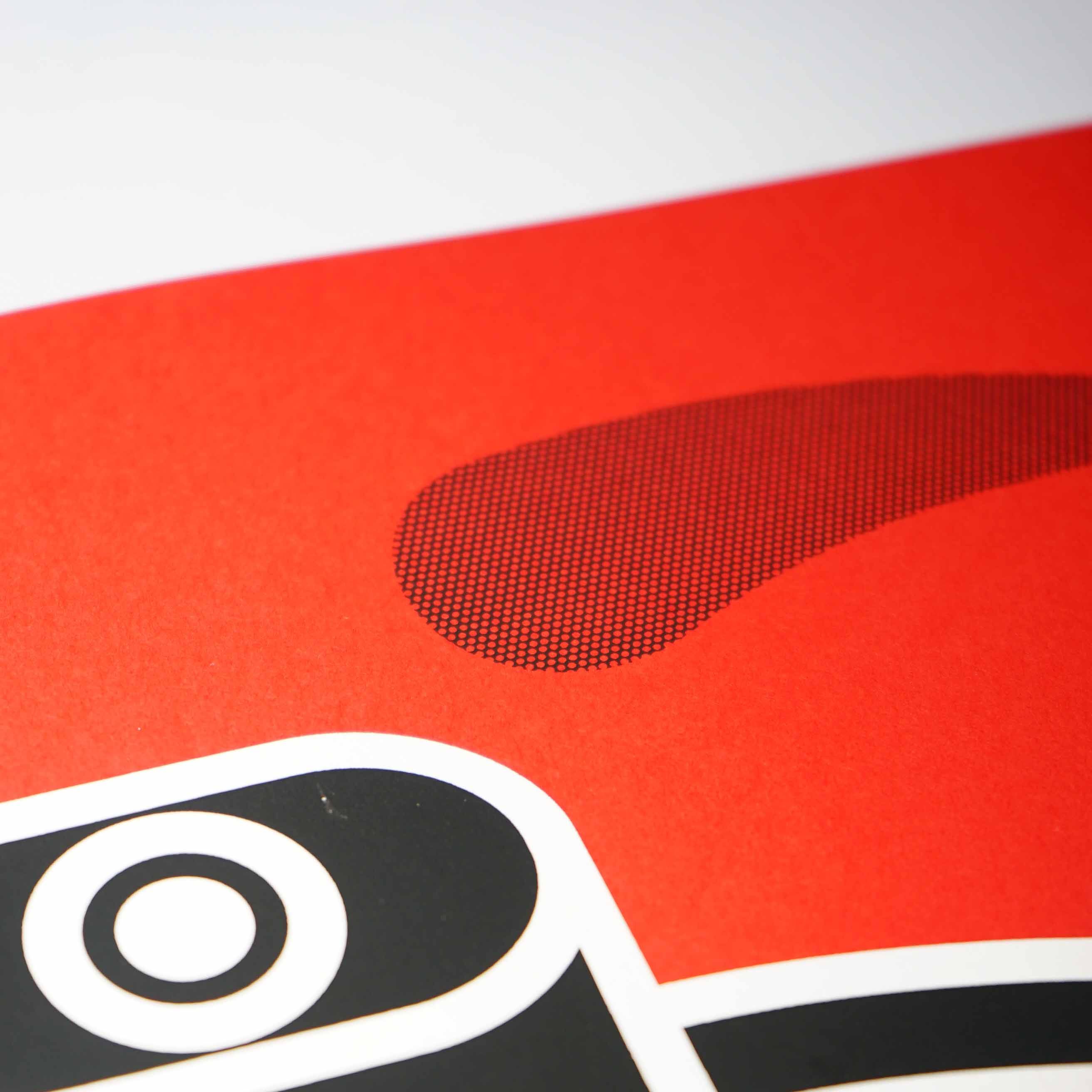 The result is a 2-color screen print on 200 g/m² Favini Burano red paper, with a limited edition of 60 copies, signed by the artist.