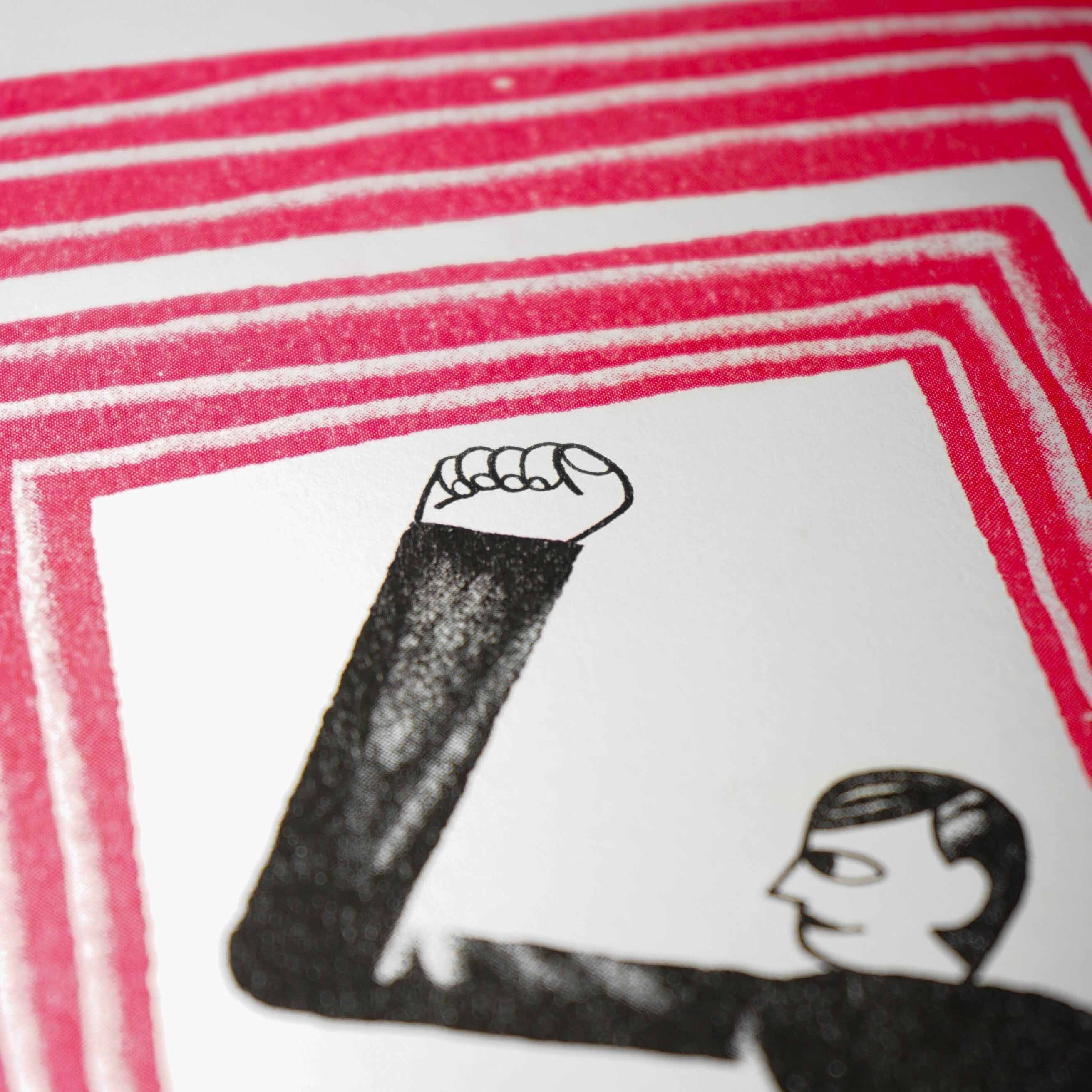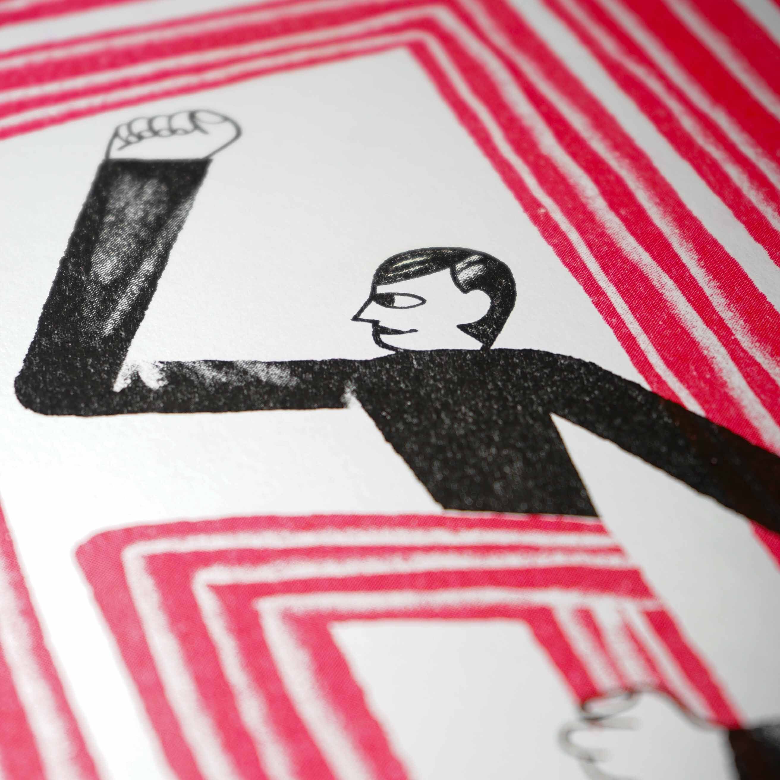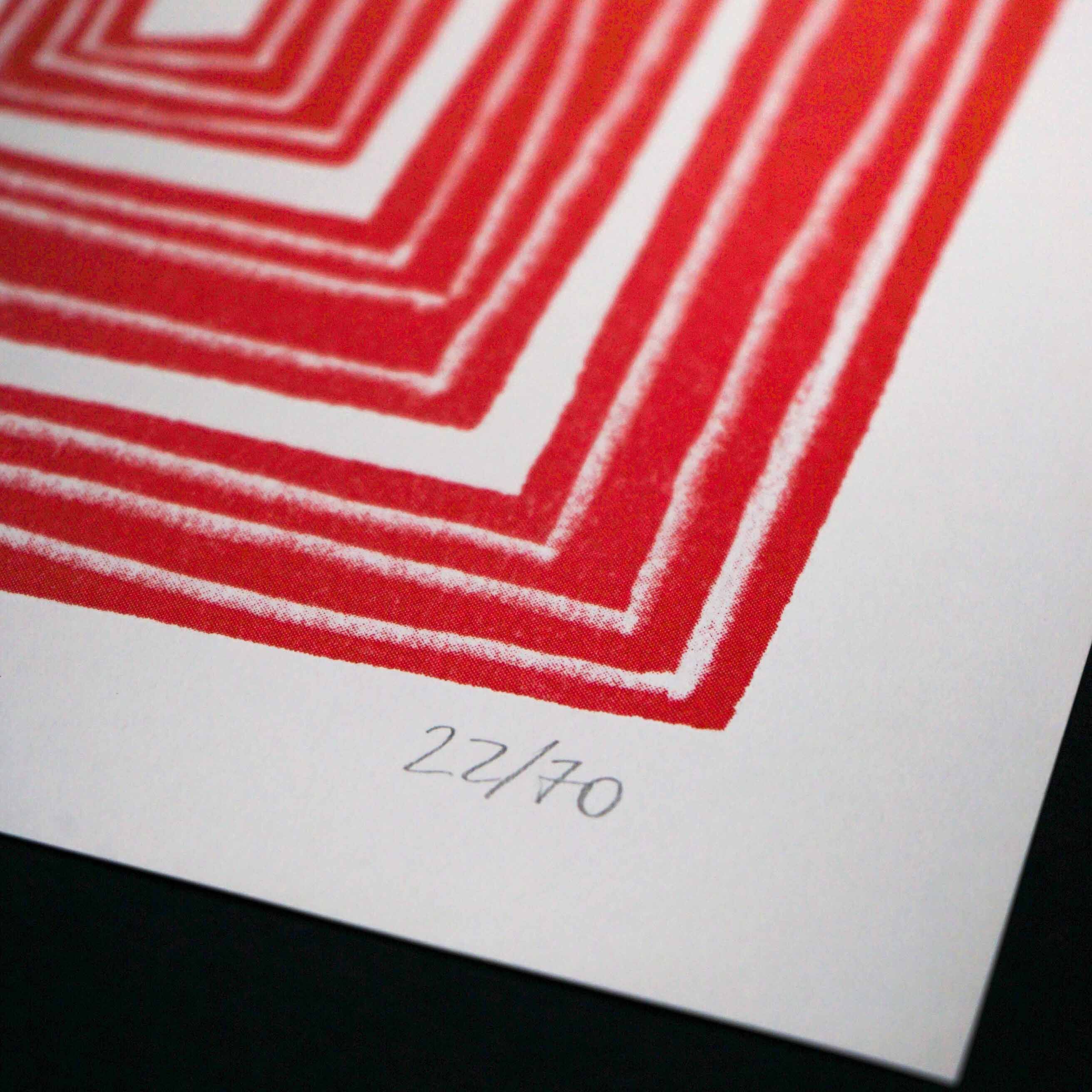 The work is a limited edition of 70 copies, signed and numbered, printed in two-color risograph on Fedrigoni paper.