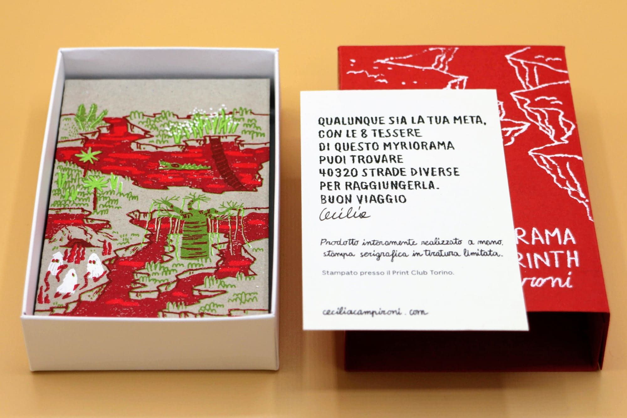 Il myriorama è un gioco illustrato nato nei primi decenni dell’Ottocento, il cui nome deriva da due parole greche: myrias (moltitudini) e orama (visione, scena). Ogni tessera è disegnata in modo da potersi combinare con tutte le altre, dando vita a panorami sempre nuovi in un intreccio infinito di possibilità. Nato in Francia e presto diffusosi nel mondo anglosassone, il myriorama faceva parte di quell’universo di meraviglie ottiche che affascinavano il pubblico prima dell’invenzione del cinema. La versione di Cecilia Campironi ne reinterpreta il meccanismo con un linguaggio illustrativo contemporaneo e uno spirito ludico che intreccia immaginazione narrativa e precisione compositiva.